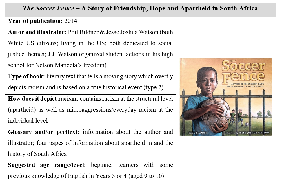 Previous research, although very scarce, supports that picturebooks have great potential to address racism with young learners. Mourão (2022) describes the use of the wordless picturebook Colour of People (Negro, 2017) with 20 pre-primary school children in Portugal and finds that the book served to initiate a discussion about identity and ‘race’ and was thereby successful in fostering competencies associated with global citizenship education. Furnes Sindland and Birketveit (2020) [iii] found in an intervention study (N = 21 Year 5 learners of English in Norway) that the use of the book The Soccer Fence (Bildner & Watson, 2014), which centres around Apartheid in South Africa, significantly increased the learners’ ability to decentre.