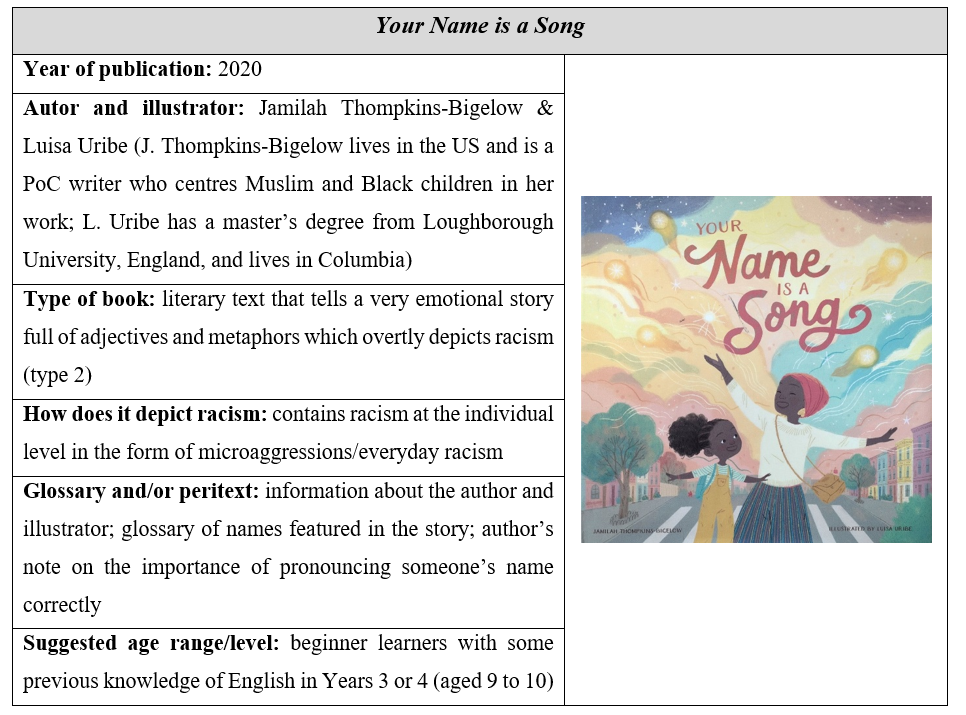 It is important to mention that the vast majority of books we found (including those presented in this article) either come from or depict the US American context. It was truly hard to find English-language picturebooks from other locations which overtly address racism. However, while racism in each country and context might somewhat differ and is rooted in specific historical events, the actual practice of racial discrimination and treating someone unfairly based on categories such as language, skin colour, external appearance or country of origin remains the same. We thus suggest that the transferability of events and racial and/or discriminatory practices as depicted in a picturebook are ‘just’ the starting point for teachers to initiate and support learners in a transfer of this to their lives, experiences, and contexts. However, this highly depends on the teacher’s skillful use of prompts and teaching activities, some of which we have outlined above. However, future research might detect books that meet the criteria established above and originate from outside the US context.